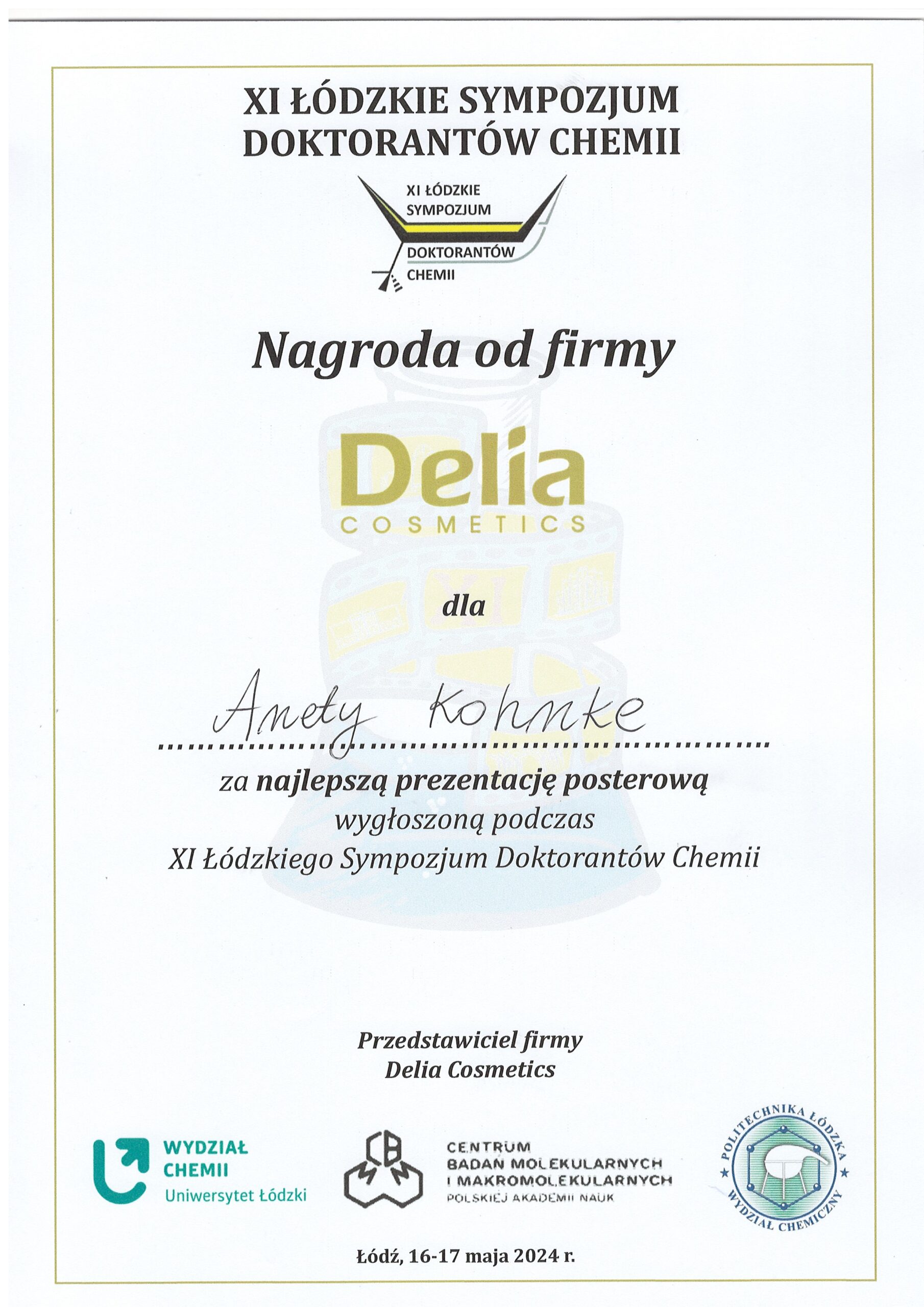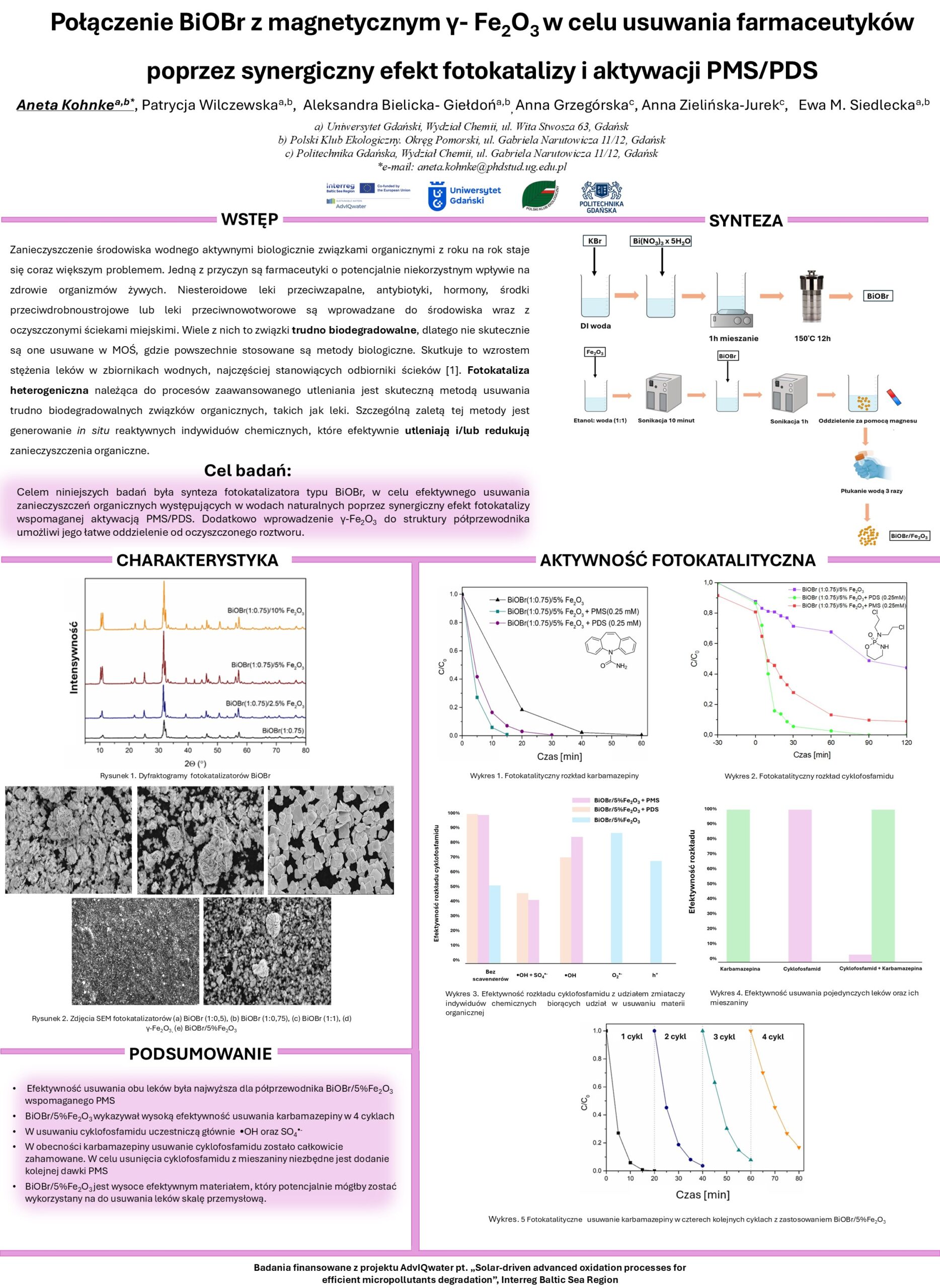 W dniach 16-17 maja 2024 r. podczas „XI Łódzkiego Sympozjum Doktorantów Chemii” zaprezentowano w formie posteru wyniki badań nad fotokatalitycznym rozkładem leków w ściekach, które zostały zrealizowane w ramach projektu AdvQIWater. Aneta Kohnke, przedstawicielka Pomorskiego Oddziału Polskiego Klubu Ekologicznego i doktorantka II roku w Szkole Doktorskiej Nauk Ścisłych i Przyrodniczych Uniwersytetu Gdańskiego, podzieliła się wynikami swoich badań i zachęciła uczestników do odwiedzenia strony internetowej projektu. Cel i wyniki projektu AdvIQWater zostały przedstawione publiczności złożonej z młodych naukowców oraz sponsorów korporacyjnych, takich jak Selvita i Trimen Chemicals. Badania nad usuwaniem cyklofosfamidu i karbamazepiny metodą fotokatalityczną zostały docenione na konferencji w Łodzi. Plakat został nagrodzony przez sponsora Delia, jako najlepsza prezentacja posterowa na XI Łódzkim Sympozjum Doktorantów Chemii.
